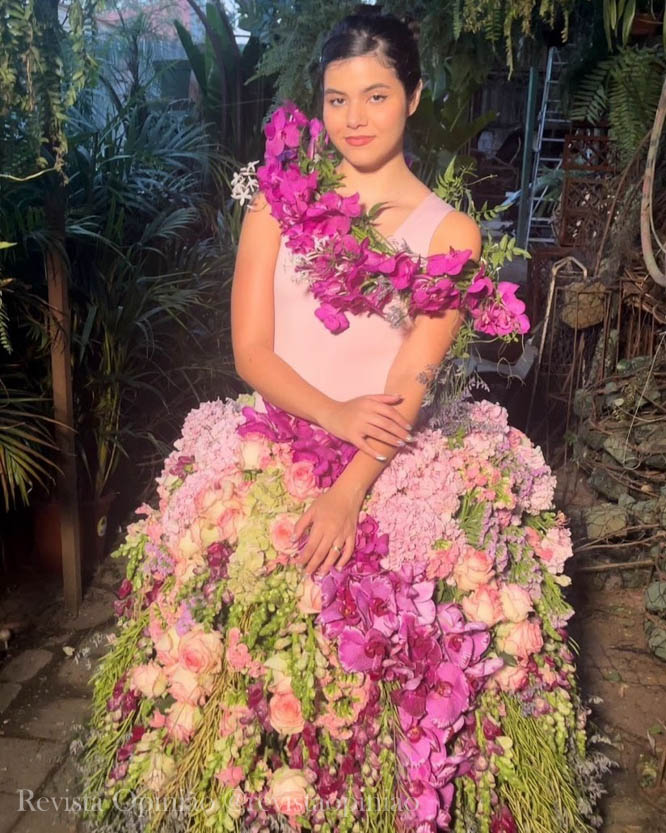 Vestindo uma criação de André Pedrotti feita só com flores naturais, nossa colunista fashion Giulia Marchetti homenageia a primavera em matéria para TV. Uma fascinante obra de arte.