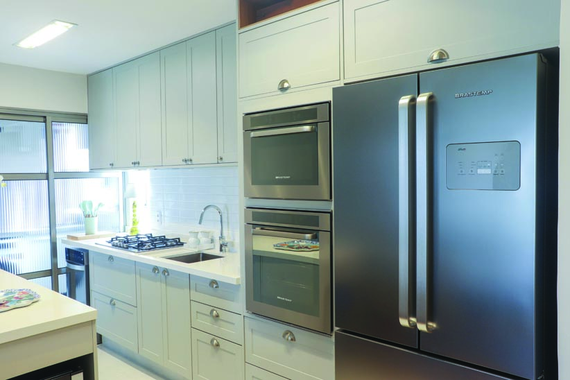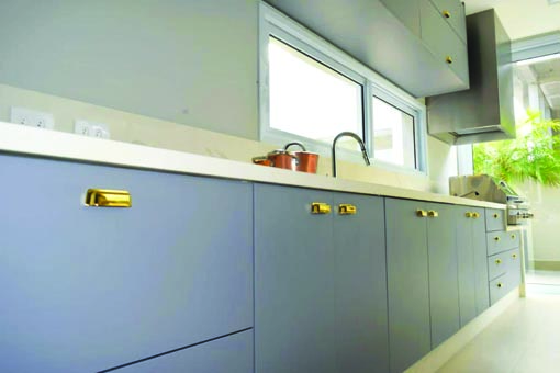 Nosso desafio foi a otimização de espaço para a funcionalidade e praticidade do ambiente. A escolha da linha contemporânea da SCA com as novas cores, predominando o Argento, eleita a cor do ano pela Pantone, conferiu modernidade ao ambiente, somado ao destaque para o ripado. Com os puxadores dourados na cozinha chegamos ao efeito que o cliente desejava ao ambiente que hoje é também espaço nobre para reunir a família e amigos.