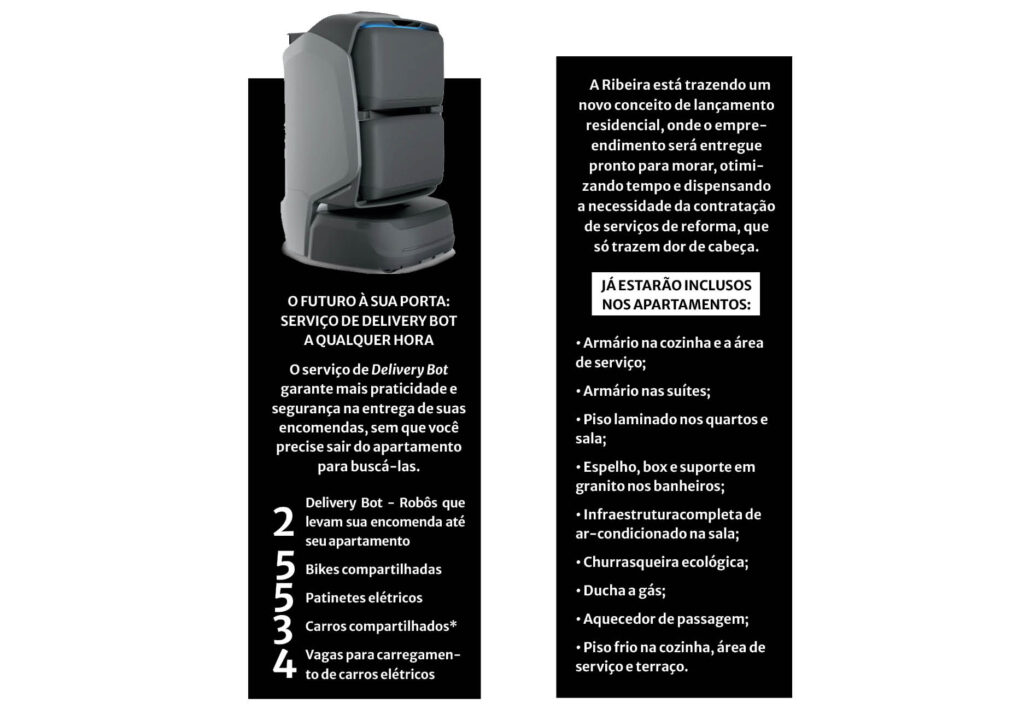 O empreendimento entregará itens de alto padrão no lazer e na conveniência, algo inédito para o segmento – e mais uma inovação da Ribeira, indo além das expectativas do futuro morador. O espaço comum foi concebido para ser uma extensão dos apartamentos, com áreas de convivência que estimulam o equilíbrio entre corpo e mente. Piscinas adulto e infantil com brinquedo aquático tipo chuveirão, casa de campo, academia equipada, espaço gourmet com churrasqueira e forno para pizza, salão de festas, brinquedoteca, parque de diversões, cinema, pet care, pet place, complexo de quadras, estúdio e espaço youtuber são alguns dos ambientes que compõem o complexo, desenhados para diferentes momentos da rotina – do relaxamento ao trabalho, da socialização à privacidade.